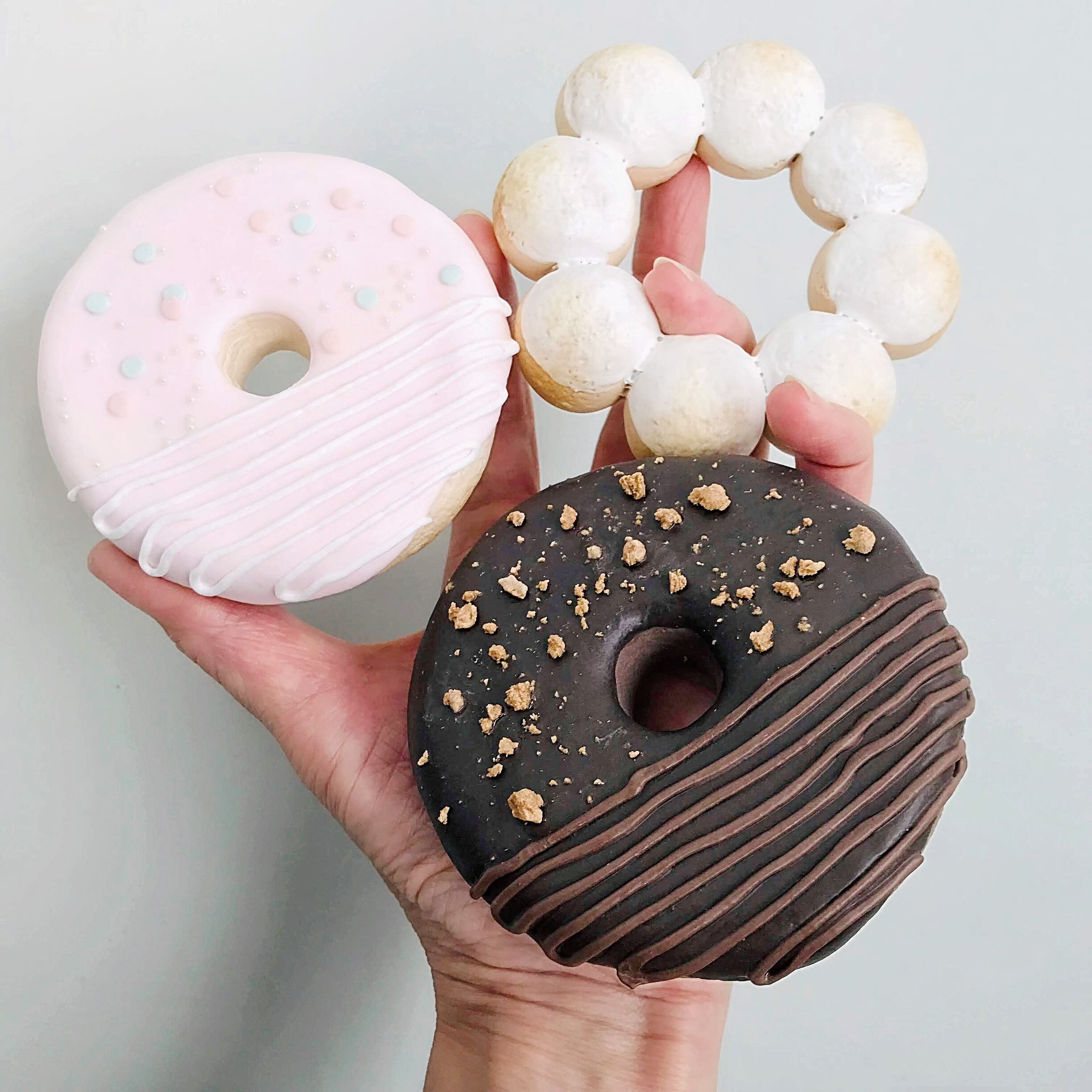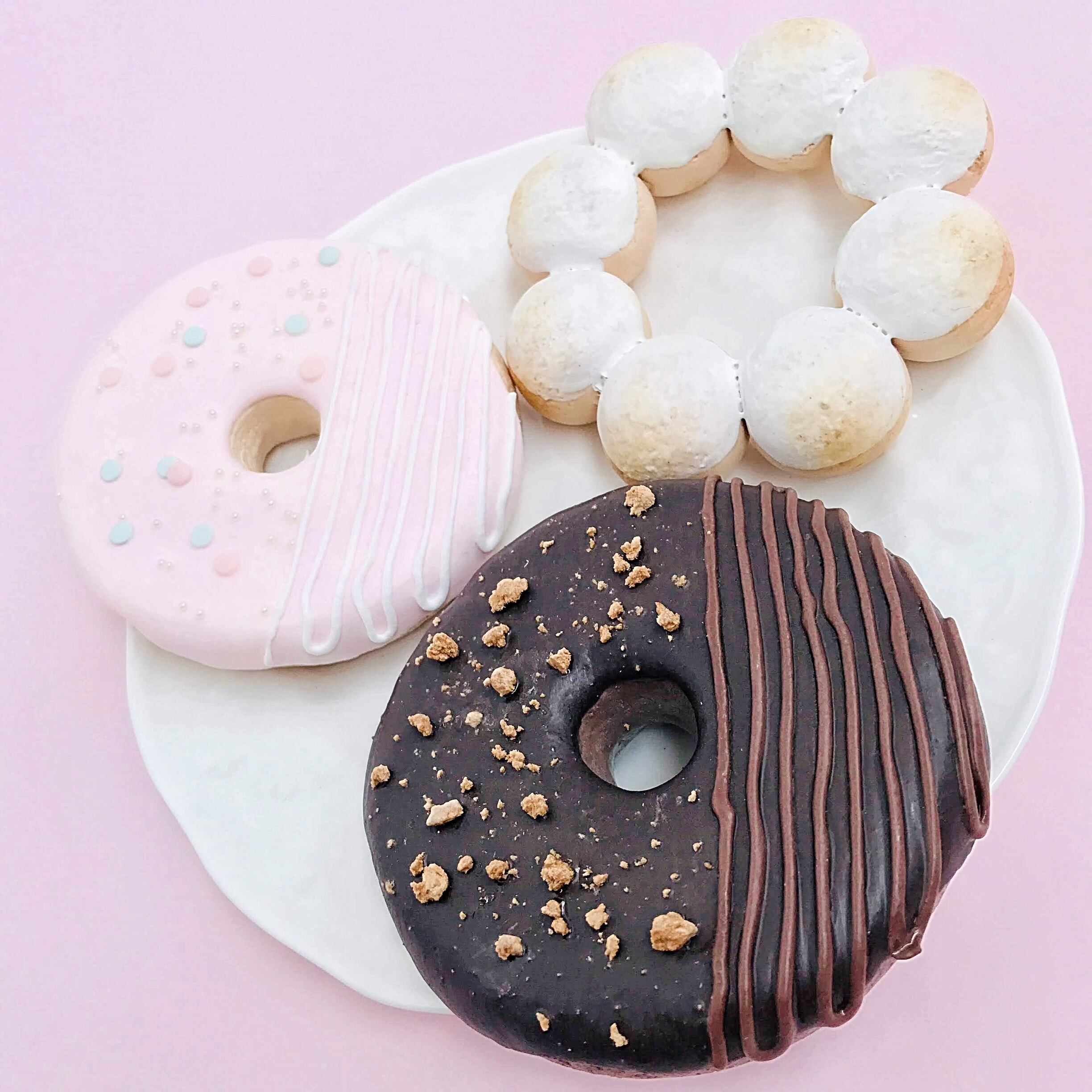 リアルで、ポップで可愛いく撮影などに適した三種類のドーナツの小道具になります。パーティーシーンはもちろん、お子様のドーナツを美味しそうに食べるシーンや遊ぶシーンなど色々な撮影でお使い頂く事で、楽しい雰囲気の写真、動画撮影を行う事が可能です。